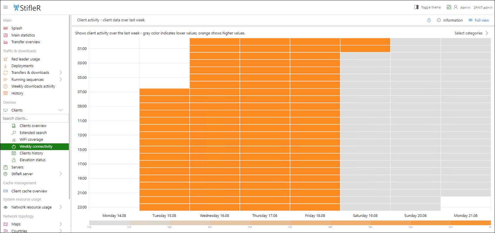 The Weekly connectivity page displays a time-based chart which highlights the client connectivity metrics based on time of day for the past week.