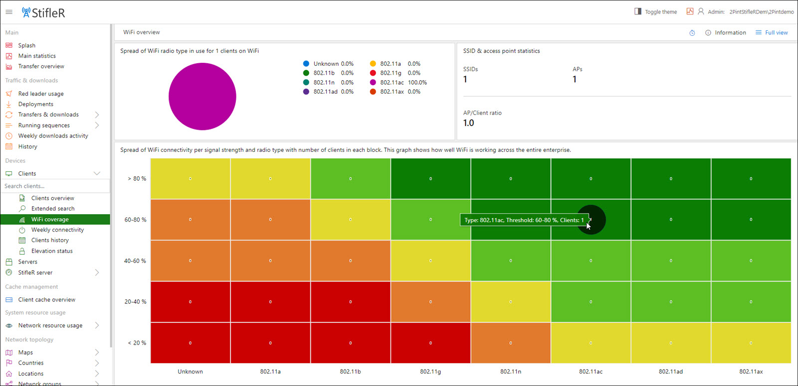 Spread of Wi-Fi radio type in use for x clients on Wi-Fi – provides a pie chart and percentages of the different types of radios in which StifleR clients are connected. SSID and access point statistics – displays a total count of SSIDs and access points reported by StifleR clients. A statistic displaying the ratio of access points to clients is also provided. Spread of Wi-Fi connectivity per signal strength graph – the graph is delineated by the different types of radios and is measured by the signal strength reported by the client.
