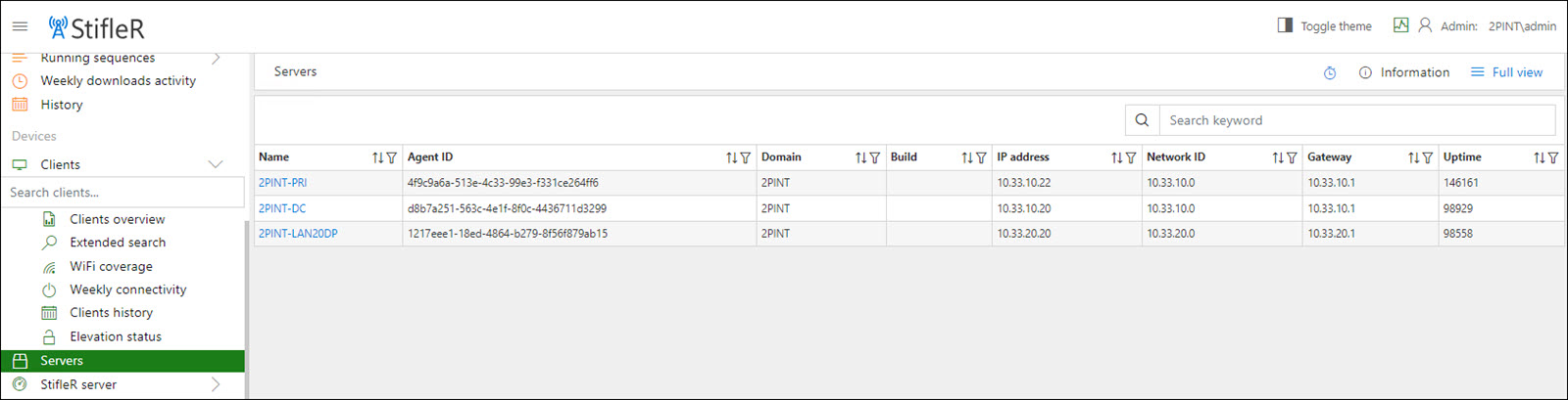 The Servers page lists the StifleR clients which are running a Windows Server operating system. To access the Client details page for a given computer, simply click the **Name**.&#x20;
