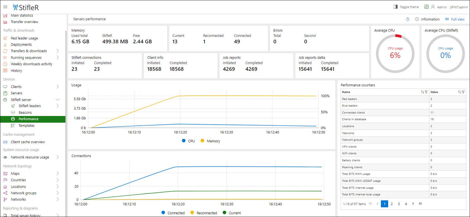 The Performance page provides an overview of the current performance of the StifleR server. Some metrics include Memory and CPU usage, Client connections, Client counts, and Download jobs.