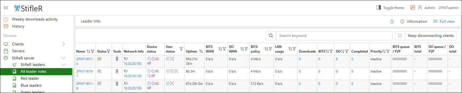 The StifleR Leaders section contains several subsections which filter the various types of StifleR clients functioning as leaders.