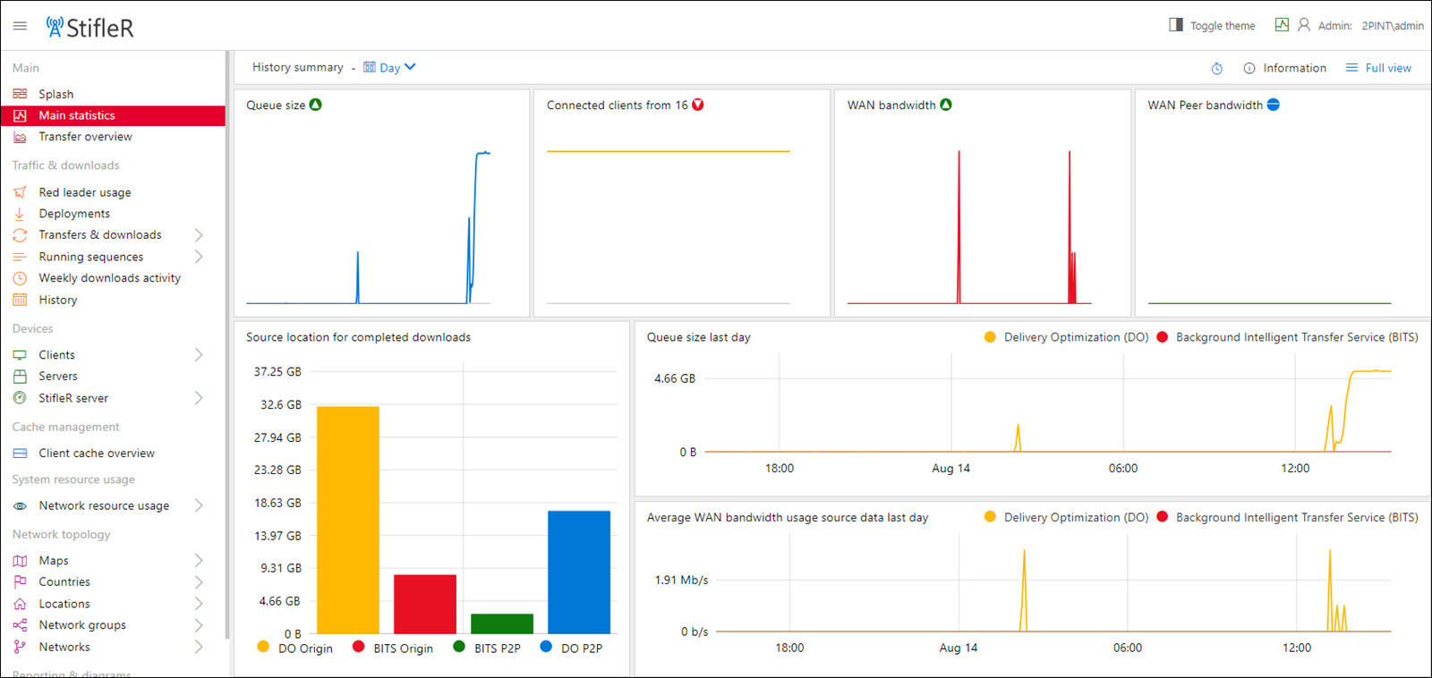 The Main statistics page provides a general overview of the content download activity reported to the StifleR server.