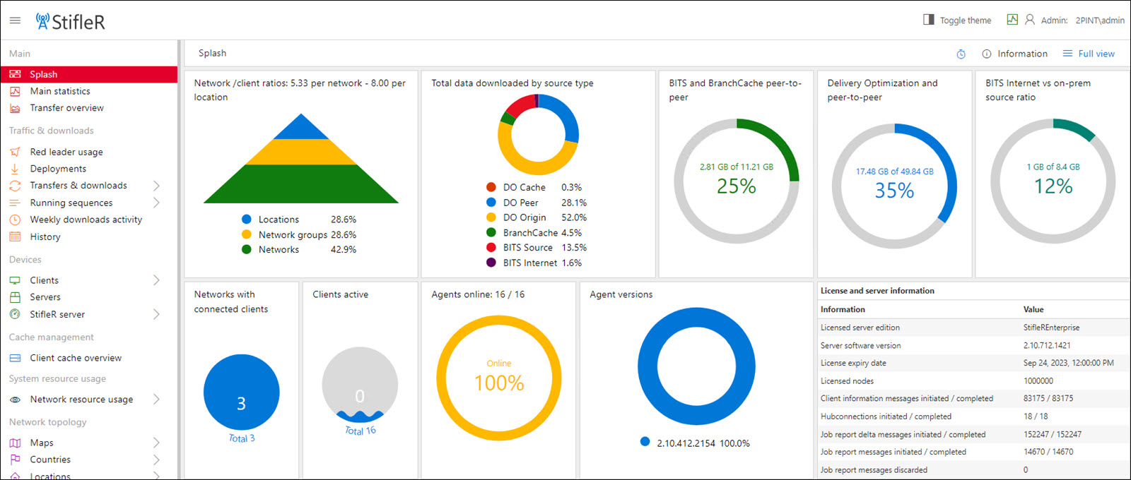 Network /client ratios – provides a breakdown of clients and their relationship to locations, network groups, and networks. Total data downloaded by source type – divides the number of downloads by source type such as the percentage of downloads which were downloaded via Delivery Optimization (DO) or BranchCache. BITS and BranchCache peer-to-peer – displays the amount and percentage of data which has been downloaded via BITS and BranchCache peers. Delivery Optimization and peer-to-peer – displays the amount and percentage of data which has been downloaded via DO and DO peers. BITS Internet vs on-premises source ratio – displays the amount and percentage of data which has been downloaded from the Internet using BITS vs on-prem sources such as distribution points. Networks with connected clients – displays the number of networks that StifleR clients have reported from. Clients active – displays the number of StifleR clients reporting to the StifleR server. Agents online – displays the number of StifleR clients reporting as online. Agent versions – displays a list and percentage of versions of StifleR clients reporting to the StifleR server. License and server information – displays information about the StifleR server license, version, and metrics which represent the general activity of the system.