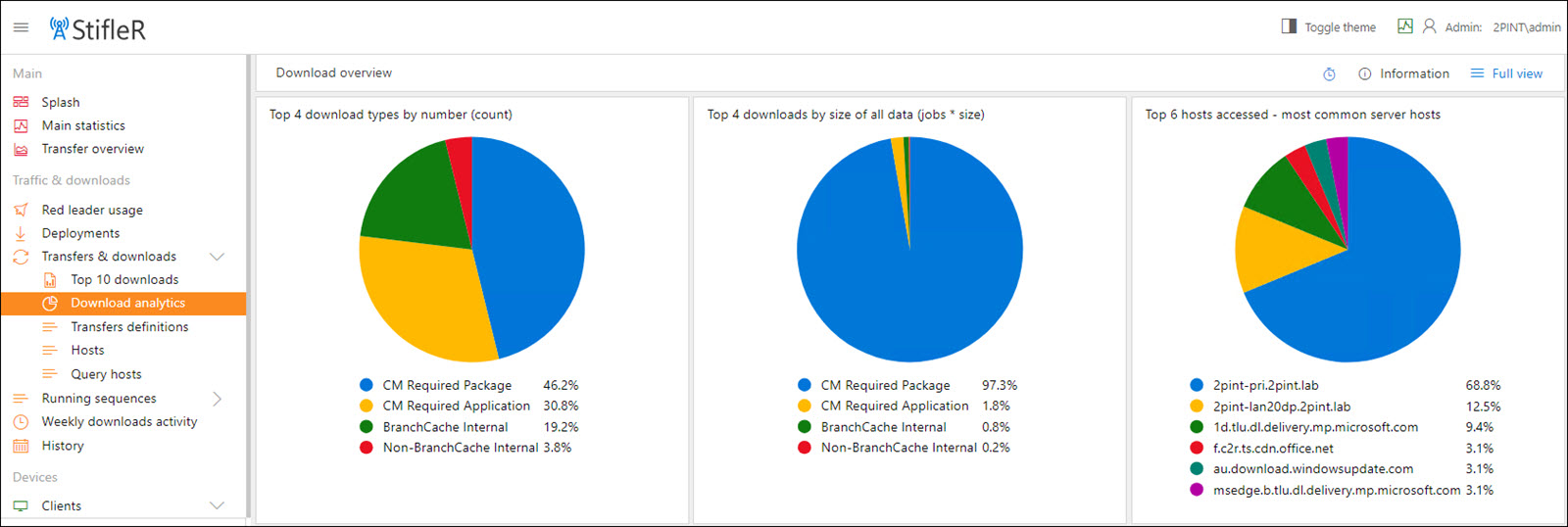 Top 4 download types – displays the top 4 download type counts. Top 4 downloads by size of all data (jobs * size) – displays the top 4 download types by size. Top 6 hosts accessed – most common server hosts – displays the top 6 downloads hosts which includes on-premises and Internet hosts such as MS CDN servers.
