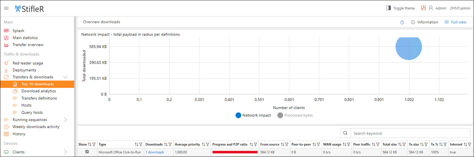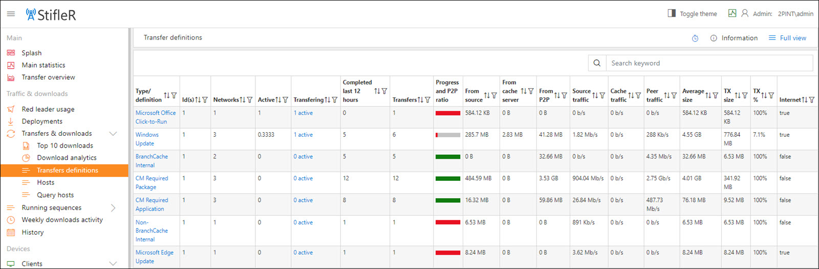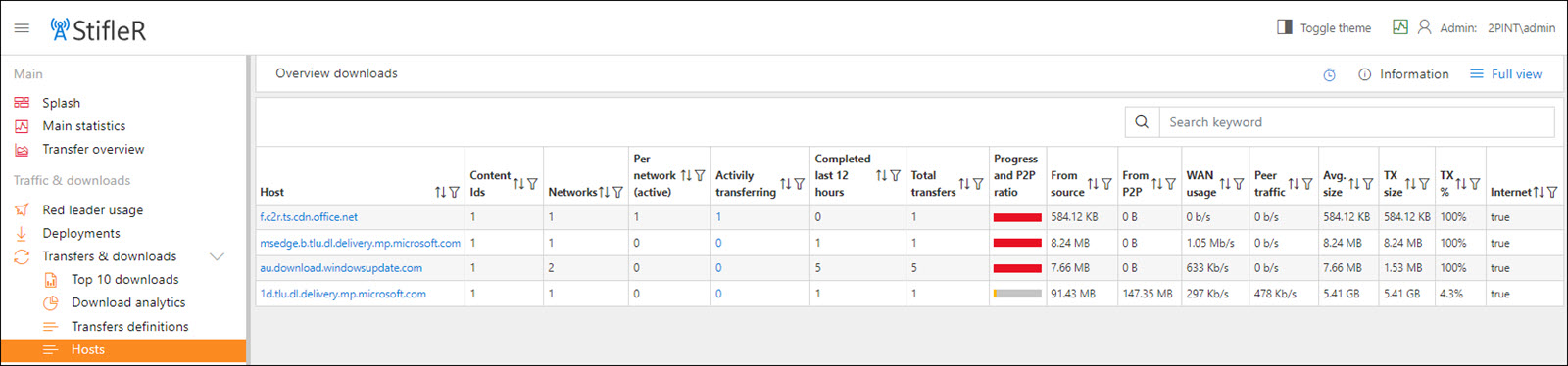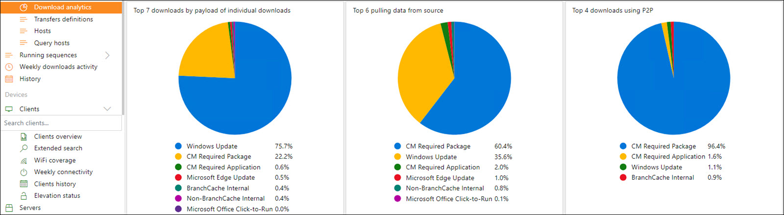 Top 7 downloads by payload of individual downloads – displays the top 7 download types by payload (size) such as Windows Updates and Office Click-to-Run. Top 6 downloads pulling data from source – displays the top 6 download types by count. Top 4 downloads using P2P – displays the top 4 download types which are being peered.