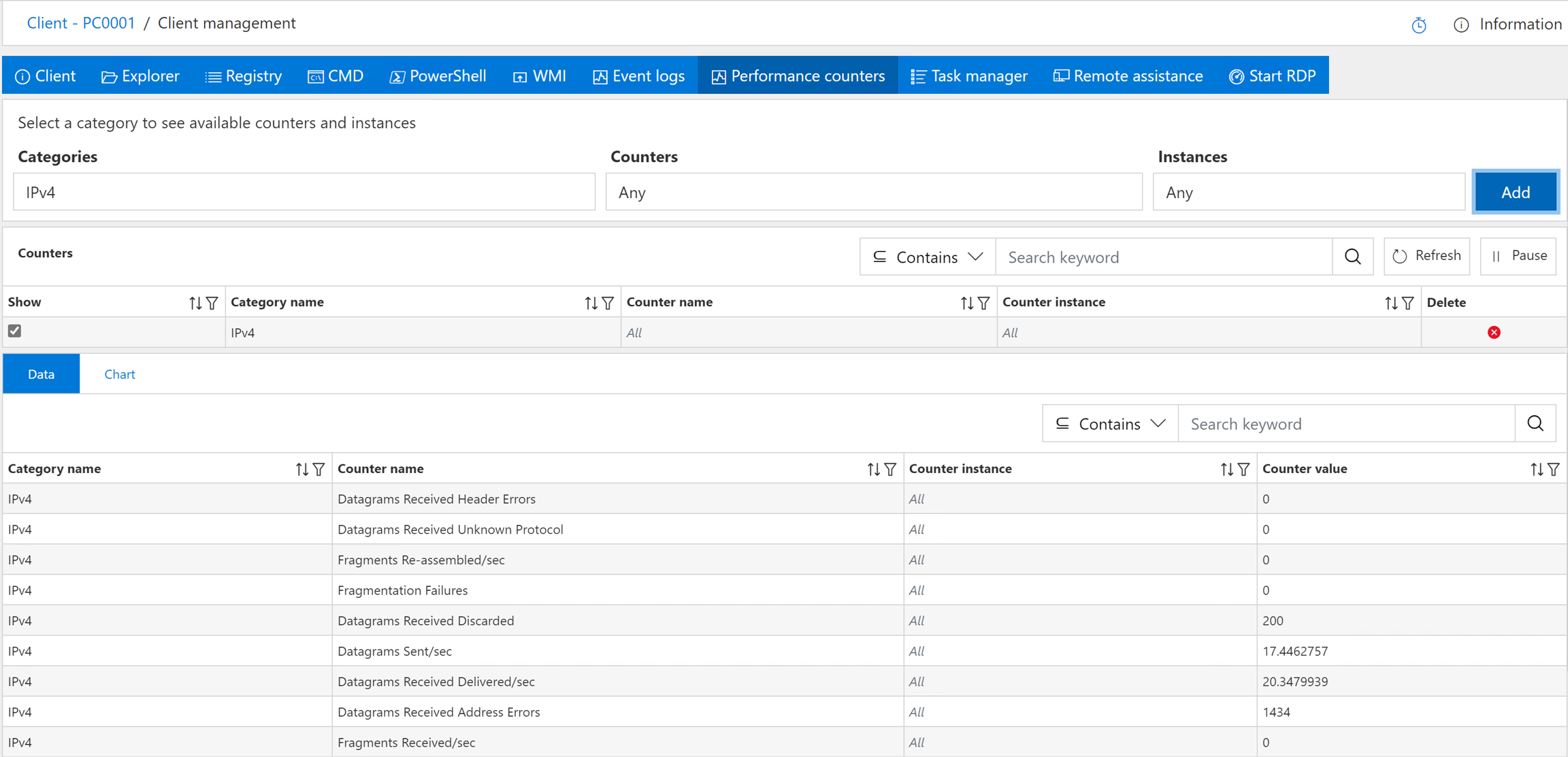 The table view allows you to define required categories and set multiple counters at once to analyze performance, compare category data with each other, check live system performance, and search and filter for results and keywords.