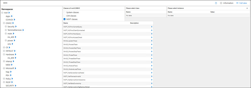 The table view allows you to expand the various WMI classes and instances on the remote machine.