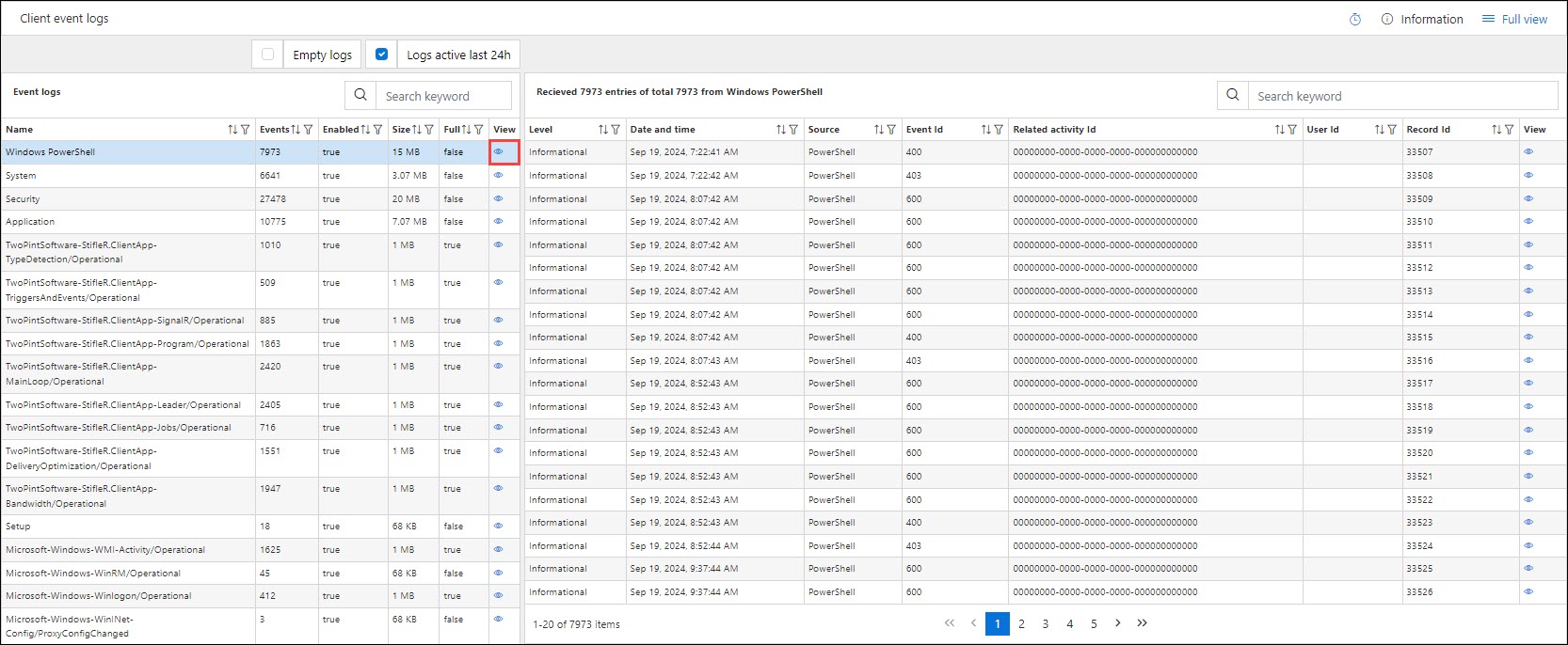 The StifleR provides remote access to Event Logs for a single device. In the left pane, select the event log you would like to view, then select the icon in the View column. The right pane should expand to enumerate the events. For more text based detail for the specific event, select the icon in the View column.